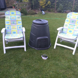 My 2 existing compost bins need shifting a bit to make room for the new arrival. I empty the contents of my "live" bin into a wheelbarrow, move the bin over and refill it; very messy work as you can see from the photo of my arm! My "decaying" bin proves surprisingly easy; a few hard shoves and I manage to move it over without removing its contents. I now have space for the new bin to slot in between them.