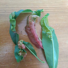 Left to right: peach leaf blight on almond leaves; mildew on apple leaf; almonds; Escallonia rubra