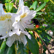 Left to right and top to bottom: ground elder (the leaves and stalks are delicious stir-fried if you pick them while they're young); ground ivy and nettles; Sonchus oleraceus L. (sowthistle, young leaves are great in salads); lesser celandine (bit of a spreader but dies off naturally around May); herb robert and garlic mustard (the leaves of the latter can be used in salads); brambles (hopefully I'll get some blackberries later in the year); bee on rhododendron (always a welcome visitor, although if bees are allowed to feed solely on rhododendrons the honey the produce is toxic for humans); dragonfly; wall ivy; dandelion (all parts of the plant can be used in food or drink).