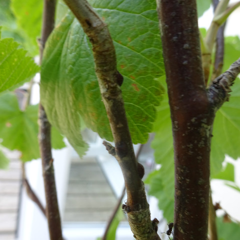 Left: greenfly on rose bush. Right: scale insects on blackcurrant stems. These look like small lumps on the stem itself, but they'll suck the sap and damage the plant if you don't get rid of them.